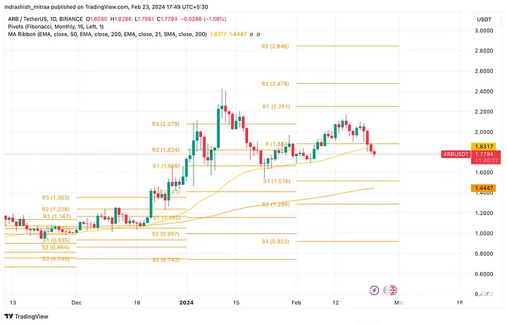 5:ARBArbitrum(ARB)是领先的第2 层扩展解决方案,已准备好抓住以太坊Dencun 升级带来的机遇。 Arbitrum 目前的交易价格为1.78 美元,市值为22 亿美元,今年迄今已实现14% 的正增长。其流通量为12.75亿ARB。此次升级对可扩展性和安全性的关注与Arbitrum 的核心目标一致,因为它利用乐观聚合机制来提高交易速度并最大限度地减少Gas 费用。