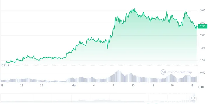 上个月FET 的增长超过了市场。从2月中旬的0.66美元开始,AI加密货币已经飙升了四倍多,首次突破了2美元的门槛。 Fetch.ai 的市值为22 亿美元,跻身加密货币100 强之列。分析师对该代币的未来持乐观态度,理由是其强大的市场地位和创新方法。有人预测,即使在比特币减半之前,其价格也可能达到5 美元。