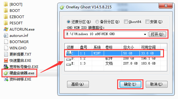 打开解压后的文件夹(Windows 10 X86),双击打开硬盘安装程序。安装程序将自动识别文件夹中准备的win10系统映像。可以参考下图的方法选择磁盘安装分区,然后点击确定。