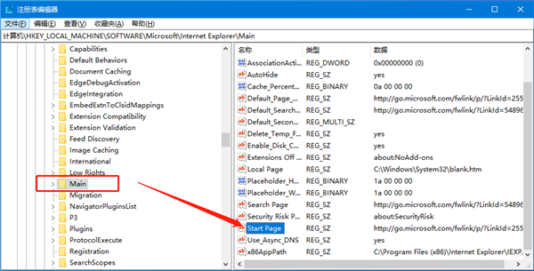 2. 找到Computer\HKEY_LOCALMACHINE\SOFRWARE\Microsoft\internet Explorer\Main\。在右边,找到。