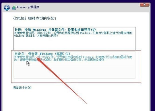 第四步:接下来,选择自定义安装。升级安装无法安装。