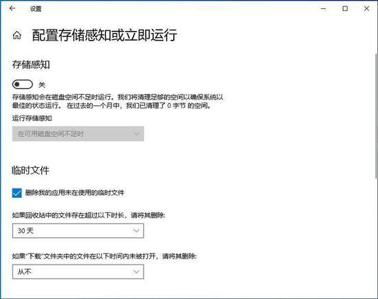 在Win10中,默认情况下不再自动清理“下载”文件夹。进入“设置-系统-存储-配置Storage Sense或立即运行”界面。可以看到“如果‘下载’文件夹中的文件在下列打开时间内没有被删除,请删除”默认设置为“从不”,这样可以防止用户丢失重要文件。