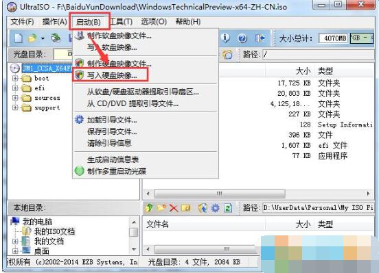 2、打开ISO文件后,点击工具栏上的“启动”,然后选择“写入硬盘镜像”;