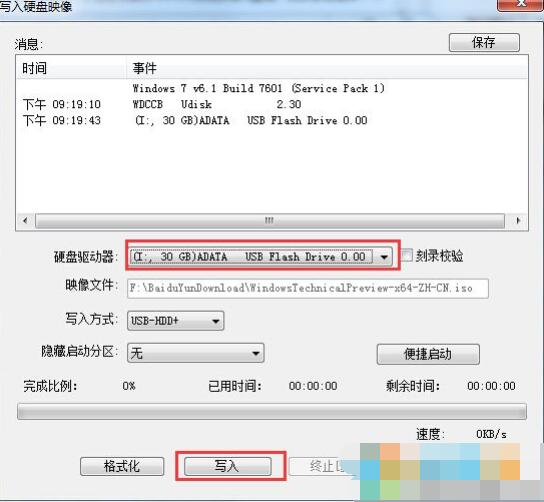 3、这时会弹出“写入硬盘镜像”窗口,确定好磁盘驱动器一项为你的U盘后,点击写入,中间出弹出格式化的提示,我们确认一次就好了。