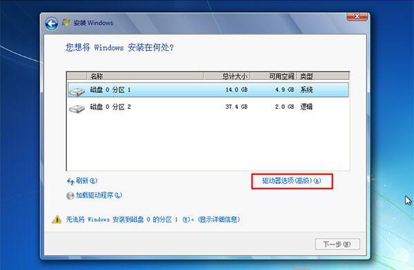5、如果硬盘是新的没有分区过则需要新建分区,如果分区过了选中要安装的分区,然后点击“驱动器高级选项”;