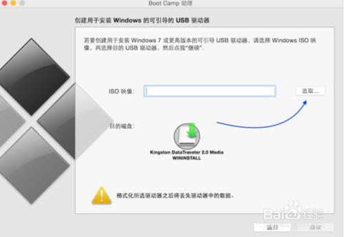 4。打开新兵训练营并检查& ldquo创建Windows7安装盘& rdquo,然后点击继续;(这个时候也可以检查下载苹果最新的Windows支持软件,也就是驱动什么的,检查安装Windows或者更高版本);