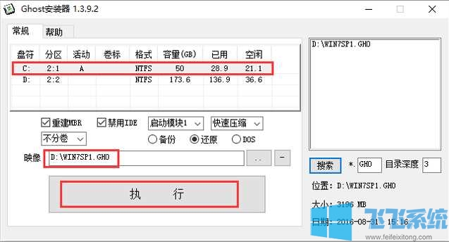2、择列表中的系统盘(默认C盘),选择“WIN7SP1.GHO”映像文件,点击执行。会提示是否重启,点击是,系统将自动安装。