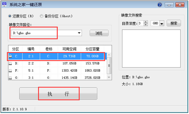 路径选择刚刚解压的DNGS_Win7x86_CJB_202005.GHO(路径和文件名不能包含中文),在下面的列表中选择C盘,点击确定。系统会询问您是否重新启动。点击是,系统会自动安装。