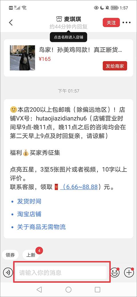 3、进入“店铺客服对话”界面,点击下方“输入框”输入您想要表达的内容;