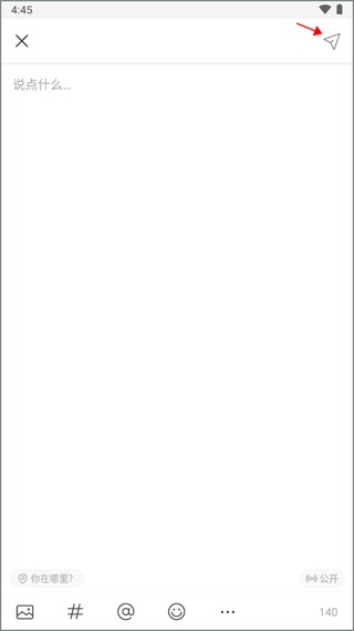4. 输入您要发布的内容和图片。写好后,可以点击右上角的箭头图标发送。这时候,就会发布一条微博。