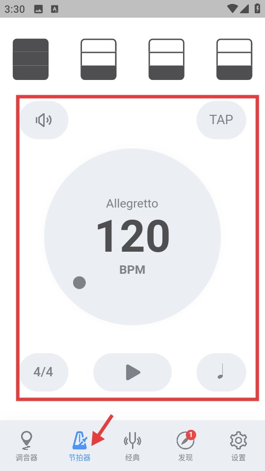 2。这是ERHU调谐器应用程序的节拍器接口。核心功能是协助Erhu实践控制节奏。您可以通过播放按钮启动节拍声音,还可以设置Beat类型,声音开关等。它是用于ERHU练习中节奏训练的实用工具。