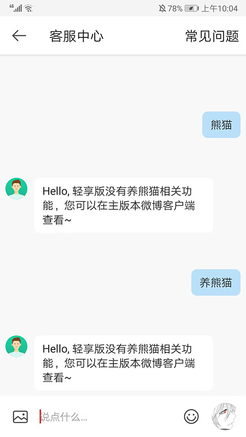 1、打开微博极速版App,在客服中心界面输入“熊猫饲养”,会看到系统提示轻装版暂时不具备饲养熊猫的功能。您可以在主版本中查看熊猫的饲养情况。
