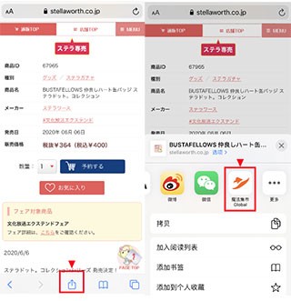 3.如果您使用的是iOS。当您使用类别导航搜索您喜欢的网站时,您将被重定向到APP默认浏览器Safari,您可以在Safari中浏览产品。在您要购买的商品详情页面,点击“分享”按钮,在更多中打开“魔法集市Global”。点击“魔法集市Global”后,页面会自动跳转回Masadora的APP,并自动为您解析网页。