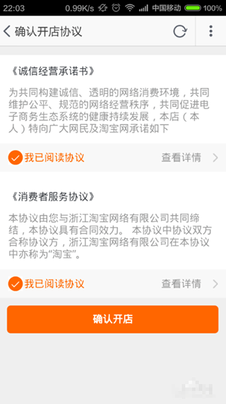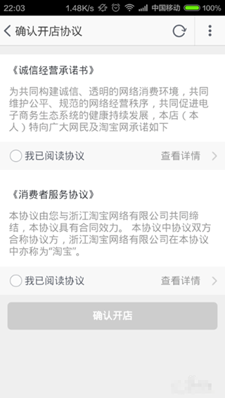 3、如果您之前没有开过淘宝店铺,点击界面出现的相关协议页面,然后选择“我已同意阅读协议”,然后点击界面下方的“确认开店”按钮;