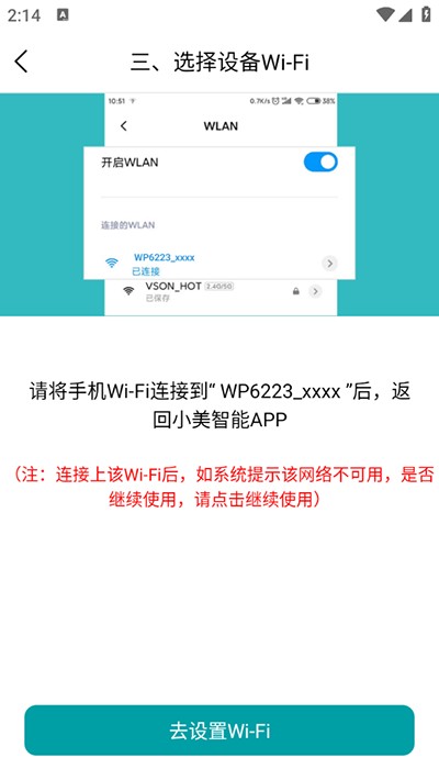 6.将手机WiFi连接到WP6223_xxxx后,即可连接设备