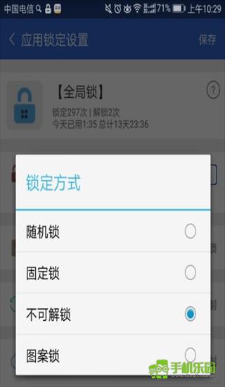 3. 点击锁定方式,包括“随机锁定”、“固定锁定”、“可解锁”和“图案锁定”。建议将睡眠时间设置为“可解锁”,以保证睡眠时间。最后,请务必单击“启用控制”和“保存”。