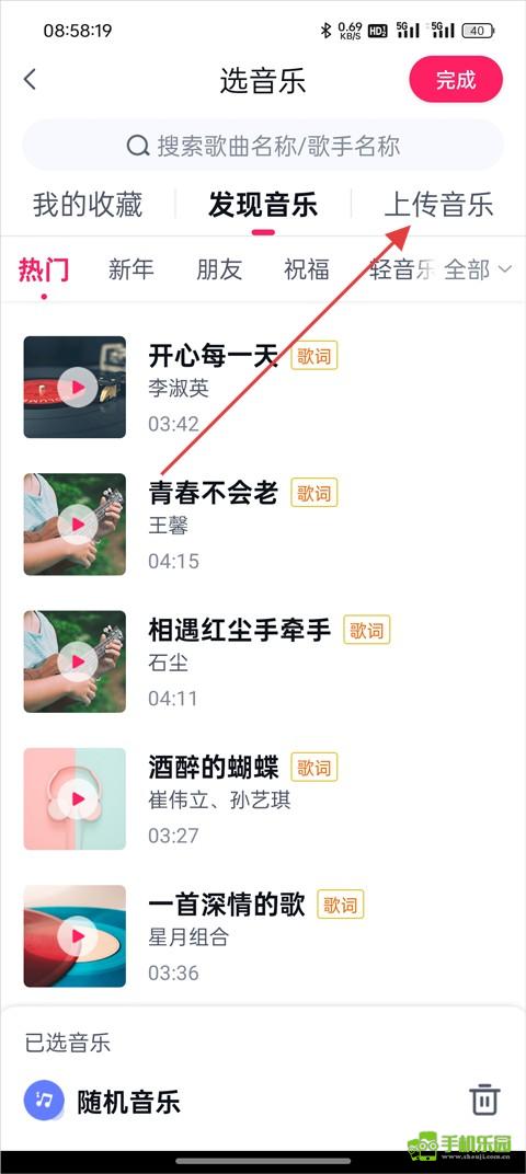 4.在音乐界面选择【上传音乐】导入您本地的音频文件;