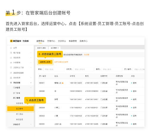 首先进入管家后台,选择运营中心,点击【系统设置-员工管理-员工账号-点击创建员工账号】