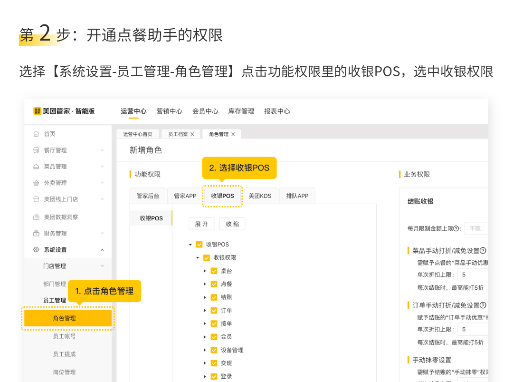 选择【系统设置-员工管理-角色管理】,点击功能权限中的收银POS,选择收银权限