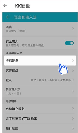 3.此外,您还可以选择进入手机的设置页面找到“语言和输入法”功能,从“虚拟键盘”功能中将KK键盘设置为默认输入。