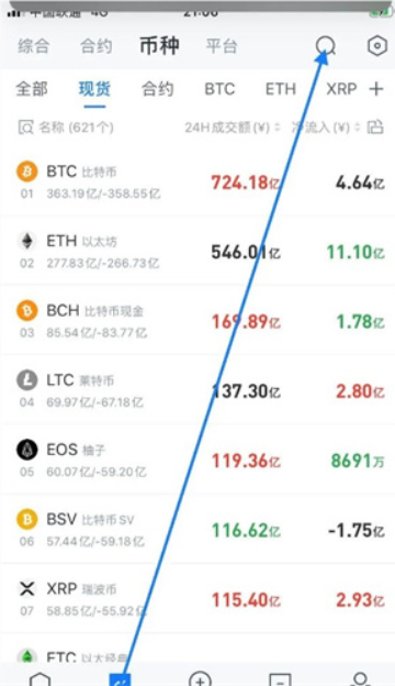 2、我们点击市场价格页面,点击右上角的放大镜按钮(箭头方向)进入搜索栏;