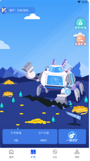 2、每天在矿机页面点击“一键挖矿”即可获得BGC币奖励,30天内共产出11个币;
