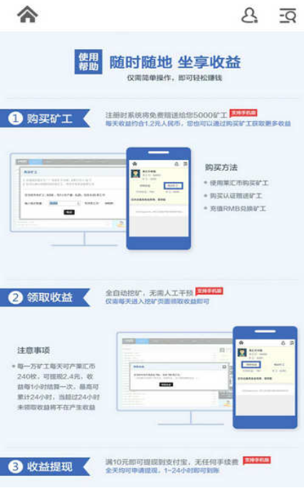 来回币:通过挖矿获得来回币,来回币可以在网站购买或者在积分商城消费,也可以提现。提现比例为1000来回币=十元。