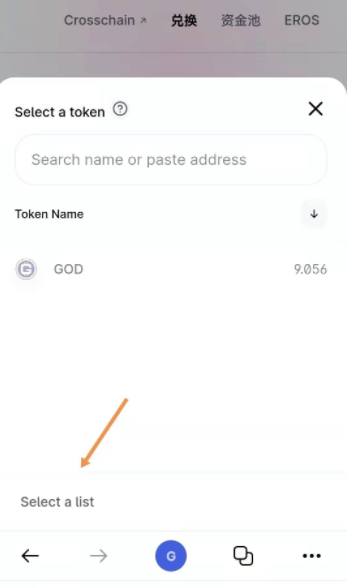 点击红色“选择”按钮,进入币种选择页面。接下来的操作就很简单了,SWAP即可。整个SWAP过程到此结束。