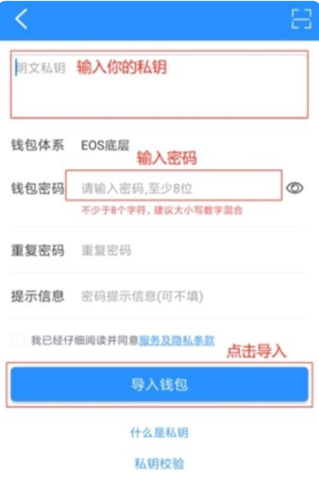 4.依次设置【钱包名称】和【密码】,然后勾选【服务和隐私条款】,点击【创建钱包】;