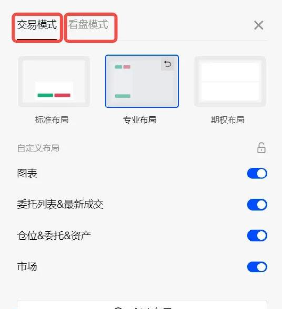 3.可以自定义交易模式和看板模式。在此选择专业布局。