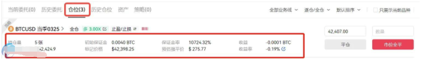 7、订单完成后,您可以在持仓界面查看该订单的相关数据,如保证金、收益、收益率、预计强平价格等。