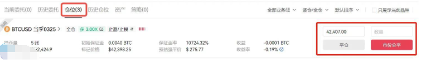 8、持仓界面可设置止盈止损。您还可以选择平仓,输入平仓价格和数量确认平仓,或者选择市场价格完成平仓操作。