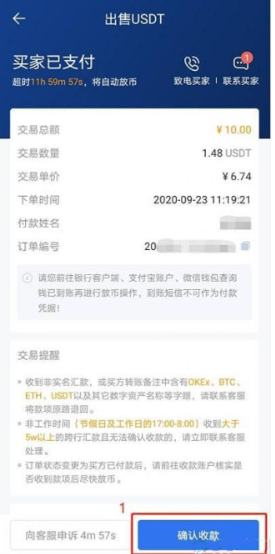 1:收到货款后请尽快放币。如果超过12小时未确认,系统将自动将币释放给买家。