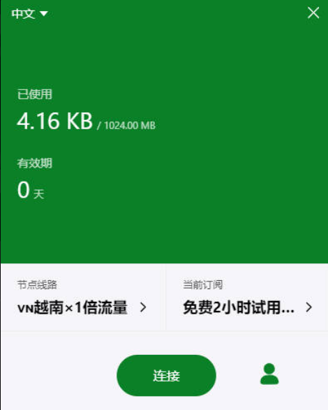 5.可以看到当前订阅显示【免费2小时试用】,选择您要使用的节点线路,按【连接】即可开始使用VPN