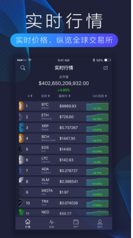 4、支持全球近2000种虚拟货币、10000多家交易所24小时实时数据;
