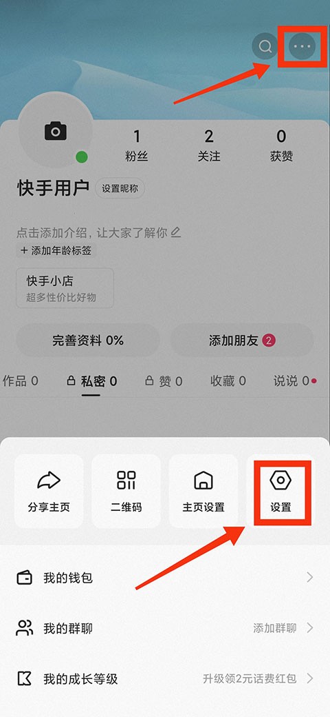 1.首先来到我的界面,点击右上角的【】按钮,然后选择【设置】。
