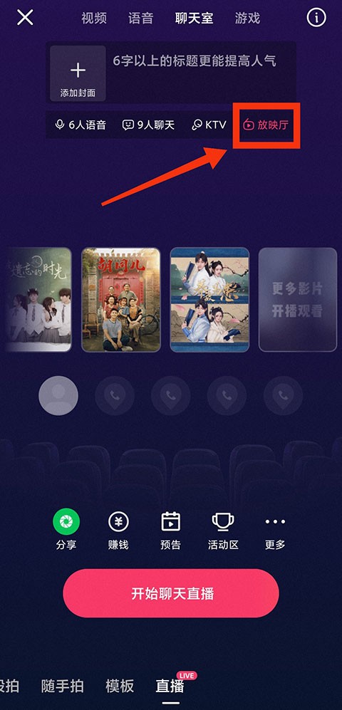 5.点击上方直播类别,选择【放映室】即可开始电影电视剧直播。