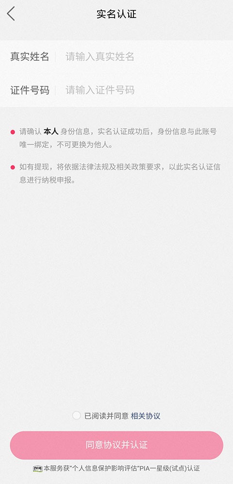 3.填写个人身份信息,勾选【同意协议】,并完成【实名认证】。