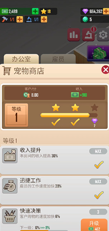 为中心添加更多功能以满足客户需求。升级你的办公室并管理你的员工以提供更好的服务!赚钱,更新你的技能和认证,并建立一个宠物服务帝国。