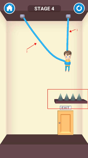 这次,尖刺被放置在小男孩的身下。一旦检测到错误的绳子,玩家就会死亡,并且玩家不会收到金币来换取皮肤。这次我会按照我标记的顺序剪断绳子。