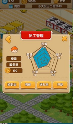 员工管理主要包括忠诚度、敏捷度、计算力、厨艺、魅力等。当然,这里的值越高,员工整体素质就越好。同时,玩家还可以调整员工薪资、送礼物、开火等不同内容。