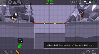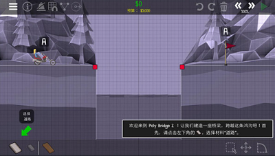 1. 欢迎来到桥梁建造者2!让我们搭建一座桥梁来跨越这个鸿沟!首先,请点击左下角的材质类型,选择材质路径。