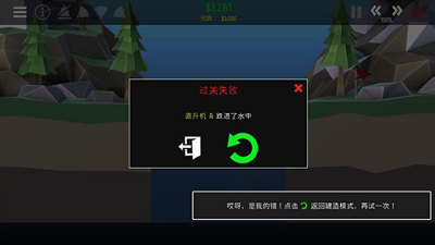 5、水平仪失败,直升机A落入水中。哎呀,是我的错!单击绿色后退按钮返回构建模式并重试!