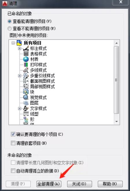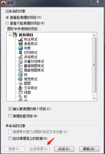 6、清理完成后,“全部清理”的按钮就显示灰色无法再按了,说明清理完成了,保存一下文件就可以了,大型文件建议多个文档保存。
