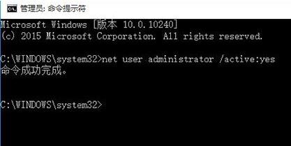 2、在命令提示符中输入如下命令后回车:net user administrator /active:yes