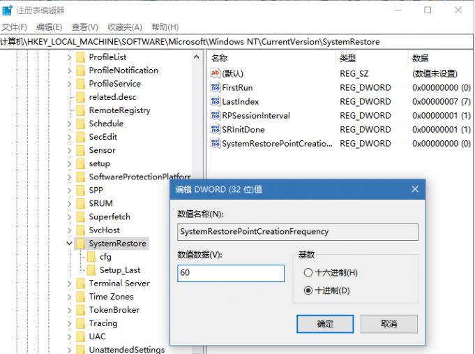 2、我们要突破这个限制达到自由创建的目的,所以需要将这个值设得小一点,例如设为60分钟。打开注册表编辑器,依次定位到“HKEY_LOCAL_MACHINE\SOFTWARE\Microsoft\Windows NT\CurrentVersion\SystemRestore”,在右侧窗格新建一个DWORD(32位)值并命名为SystemRestorePointCreationFrequency,双击设置其数值数据,将“基数”选为“十进制”,数值数据填写为60即可,上述值设置为0,则没有时间限制,如图: