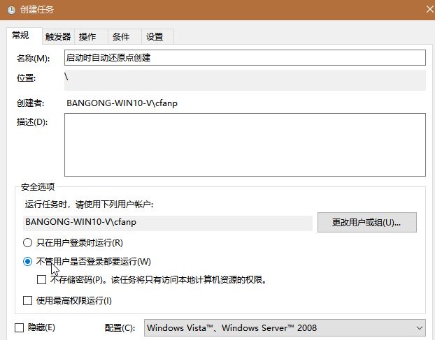 4、在“常规”选项卡中命名计划任务名称,如“启动时自动还原点创建”,同时选中“不管用户是否登录都要运行”选项,如图: