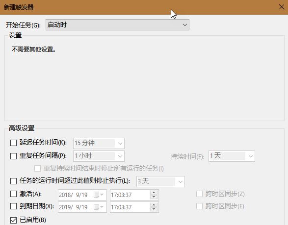 5、点击“触发器”选项卡并点击“新建”按钮创建新的触发器,将“开始任务”条件选择为“启动时”,如图: