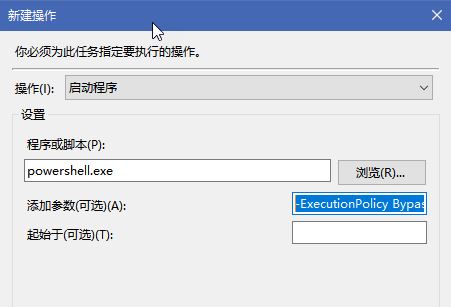 6.、切换到“操作”选项卡,执行“新建”操作,将操作动作设置为“启动程序”,程序或脚本填写为“powershell.exe”,添加参数“-ExecutionPolicy Bypass -Command "Checkpoint-Computer -Description \"Startup RestorePoint \" -RestorePointType \"MODIFY_SETTINGS\""”,如图: