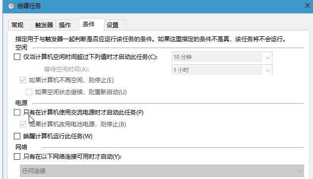 7、在“条件”选项卡中,取消对“只有在计算机使用交流电源时才启动此任务(如果计算机改用电池电源,则停止)”和“唤醒计算机运行此任务”两个选项的勾选,如图: